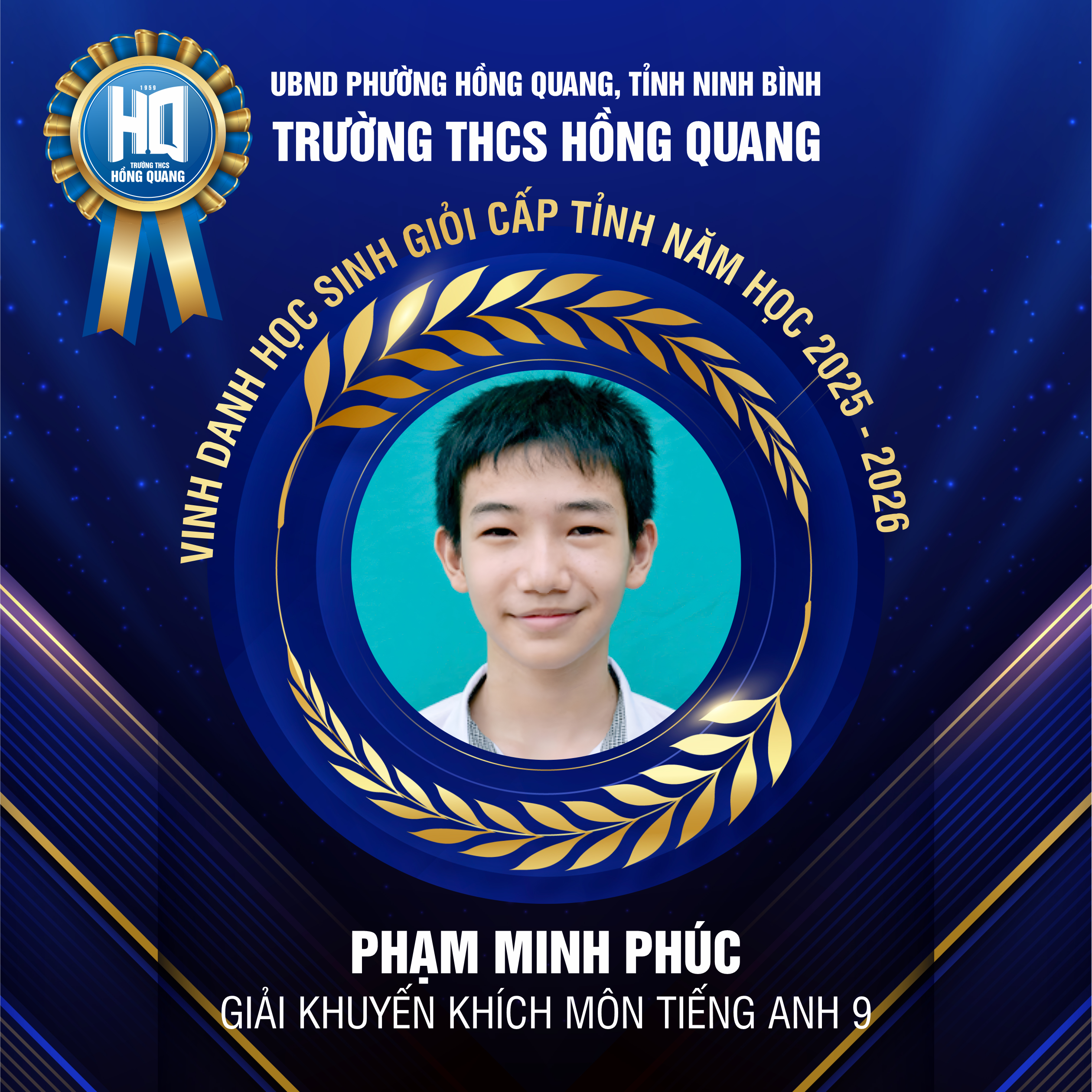 - Em Phạm Minh Phúc, học sinh lớp 9D, cô giáo Trần Thị Minh Nguyệt lãnh đội, đạt giải Khuyến khích môn Tiếng Anh lớp 9.
